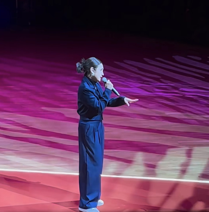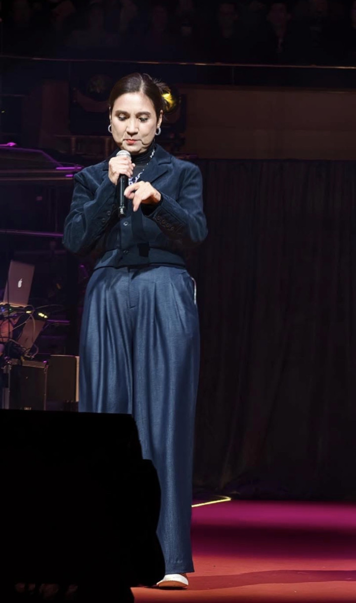 64岁的戚美珍当晚精心打扮了一番,因为要登台演出,所以穿着显得隆重——一身深蓝色,上身是蓝黑色的收腰小西装,下身是亮面质感的阔腿裤,胸前还挂了一串闪耀的钻石珠宝,贵气十足。戚美珍已经不复当年勇,如今她身材发福,有肉眼可见的皱纹,面部也显得松弛,而她穿了阔腿裤,以及收腰的衣服,大概也是为了遮掩身材上的不足。不过客观来说,她个人的状态还不错,认真打扮了一番之后,气质还是出众的,依然能够感受得到当年的风采,形容起来她就是优雅地老去了,状态真实。