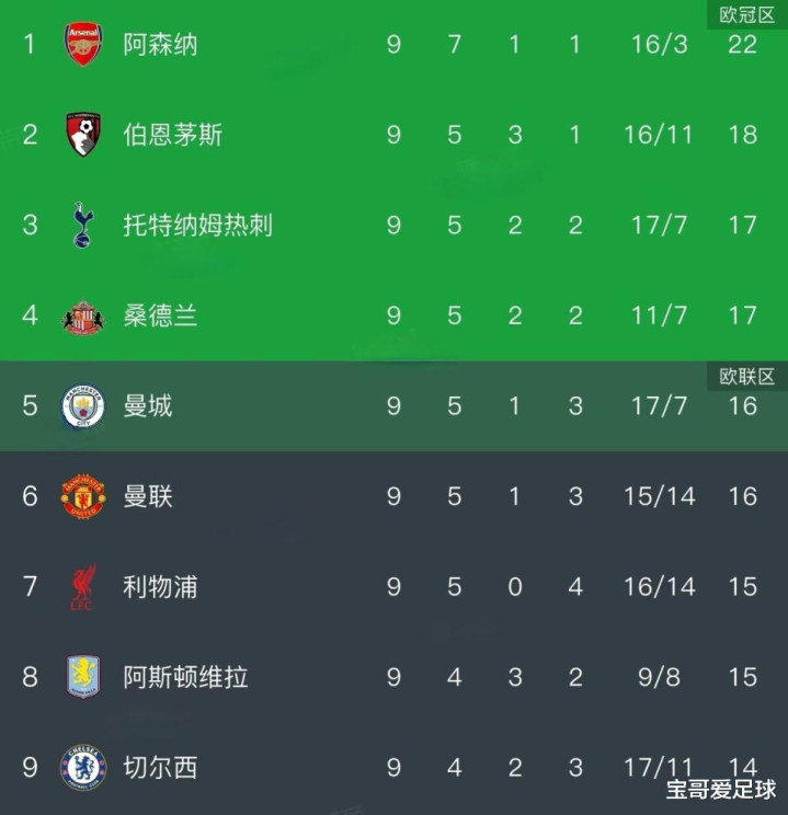 英超第9轮结束后,看看现在积分榜上的排名,有种恍如隔世的感觉,英超大变天了!千年老二阿森纳目前高居榜首遥遥领先,领先老对手曼城、利物浦和曼联至少两个胜场;英超BIG6的其余5支球队热刺、曼城、曼联、利物浦和切尔西中只有热刺杀进了前四,但也足足落后阿森纳5分!夏窗卖光后防线的伯恩茅斯和升班马桑德兰都进入了前四,这还是我们熟悉的英超吗?