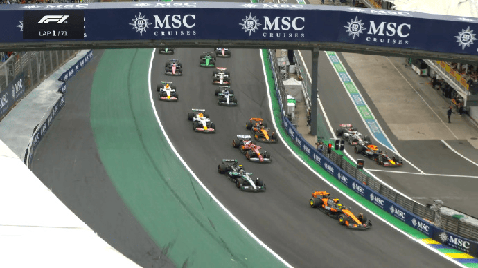 虎扑11月10日讯在刚刚结束的F1圣保罗站正赛中,诺里斯轻松领跑夺冠,安东内利排在第二,维修区起步的维斯塔潘拿下第三,拉塞尔位列第四,皮亚斯特里排在第五,排名6-10位的分别是贝尔曼,劳森,霍肯伯格,哈贾尔和加斯利。法拉利双车退赛,博托莱托在比赛初始阶段上墙退赛。