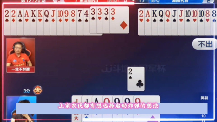 地主这牌有点厉害,开局一个三飞机,然后出圈回二,还是直接卖二。底牌当中的圈为什么不带出去?带了一张勾,一张k。上家农民手握炸弹,不过上家农民这牌有点厉害。如果开局调单,上家农民有没有可能顶二?卖二,上家农民有可能要炸了,有可能要选择开炸。因为开局那手飞机,上家农民都有想选择启动炸弹的想法,现在肯定炸。