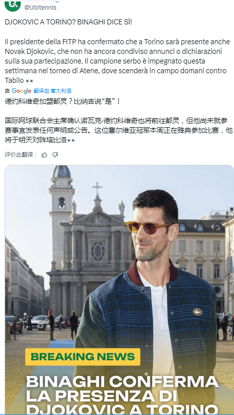 虎扑11月04日讯据外媒Ubitennis报道,意大利网球联合会主席表示德约科维奇将参加下周在都灵进行的ATP年终总决赛。